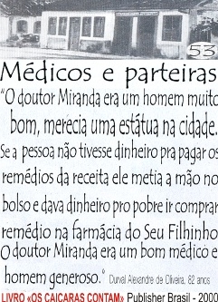 Tem este relato a finalidade de esclarecer o outro lado da história sobre a saúde daquela época em Ubatuba, para os nossos leitores migrantes, que fixaram residência definitiva ou de passagem, principalmente para fortalecer a memória dos nossos caiçaras da gema e do Centro, das praias e dos sertões. Essa história de que em Ubatuba não tinha médico durante duas décadas, não é bem assim não, eles falam, mas não citam em que década. A década foi a de 20 e parte da de 30, porque em fins de 1935, foi instalado precariamente o primeiro Posto de Saúde de Ubatuba, sob o comando do médico Dr. João Carlos de Miranda, O Dr. Miranda, como ficou conhecido. Veja na foto o que diz o depoente: Sr. Durval Alexandre de Oliveira, de 82 anos, caiçara da gema e da praia do Puruba, nasceu em 1918 (Os Caiçaras Contam, editado e produzido pela editora Publischer Brasil, setembro de 2000, página 53. Administração Zizinho Vigneron).