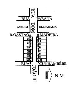 O croqui mostra a rua D. João III terminando na rua Cunhambebe. Esse local chamava-se rua Nova e a invasão na projeção da rua só chamou atenção quando foram abertas as ruas do loteamento Jardim Umuarama. Para a sorte da cidade, o proprietário do loteamento era o Sr. Roberto Nelsen, topógrafo e homem de visão. Ignorando este estrangulamento, seguiu a projeção da rua D. João III, apesar de o Jardim Umuarama ter sido aprovado por volta de 1954. 40 anos depois, neste local continua tudo igual, mas, com um agravante, as casas que eram rústicas foram reformadas e ampliadas, recebendo acabamento de primeira, e algumas devidamente aprovadas pela prefeitura.