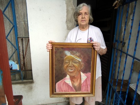 Observa-se na imagem acima a artista da qual eu falo e em suas mãos o seu trabalho de pintura, um quadro (pintura a óleo) da imagem do Amaro, do negro Amaro; personagem que por muitos anos viveu no centro comercial de Ubatuba. Era um mendigo, amável, simpático, respeitador. Quando sóbrio era um sonhador, poeta, pensador e amante da natureza. Quando ébrio era brincante, festeiro, carnavalesco, lúdico.
