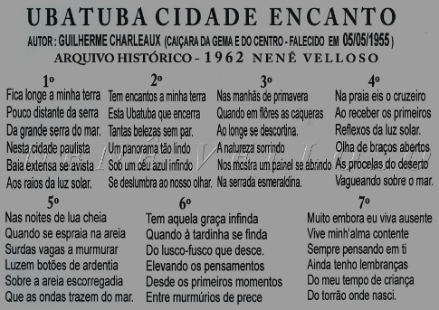 Guilherme Charleaux, ubatubano da gema e do Centro, é o autor dessa poesia. Charleaux profetizou a própria morte. Disse que morreria em dia, mês e ano terminados em cinco. Morreu em 05-05-1955, na cidade de Santos, SP.